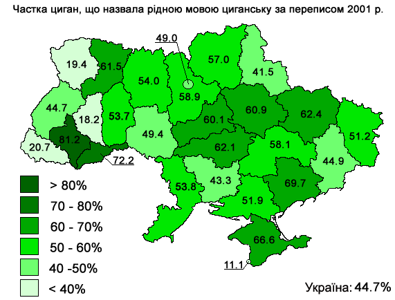 Странно выглядят Ивано-Франковская и Черновицкая области с очень высоким процентом цыганоязычных. Если предположить, что большинство не указавших язык на Закарпатье в действительности цыганоязычные, то все выглядит логично. Тогда процент цыган Закарпатья с родным цыганским языком составляет 82-83%, и высокий процент в других областях просто объясняется миграцией цыганоязычных цыган из Закарпатья. Но, скорее, причина в чем-то другом.