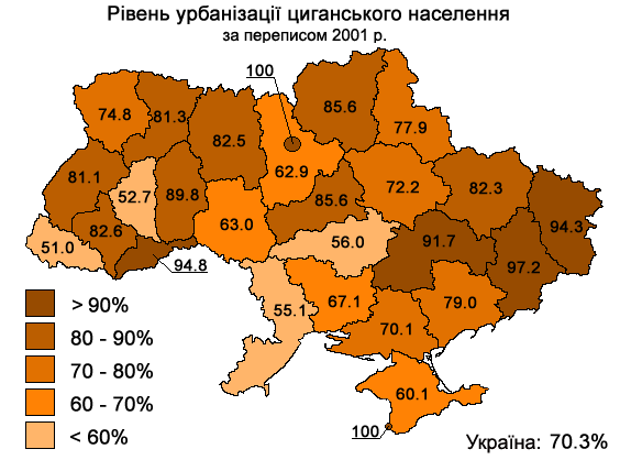Основные регионы урбанизации цыган на востоке и западе, самая низкая численность «городских» цыган на юге и Закарпатье. В последнем, например, проживает 52% всех сельских цыган Украины и только 21% городских.