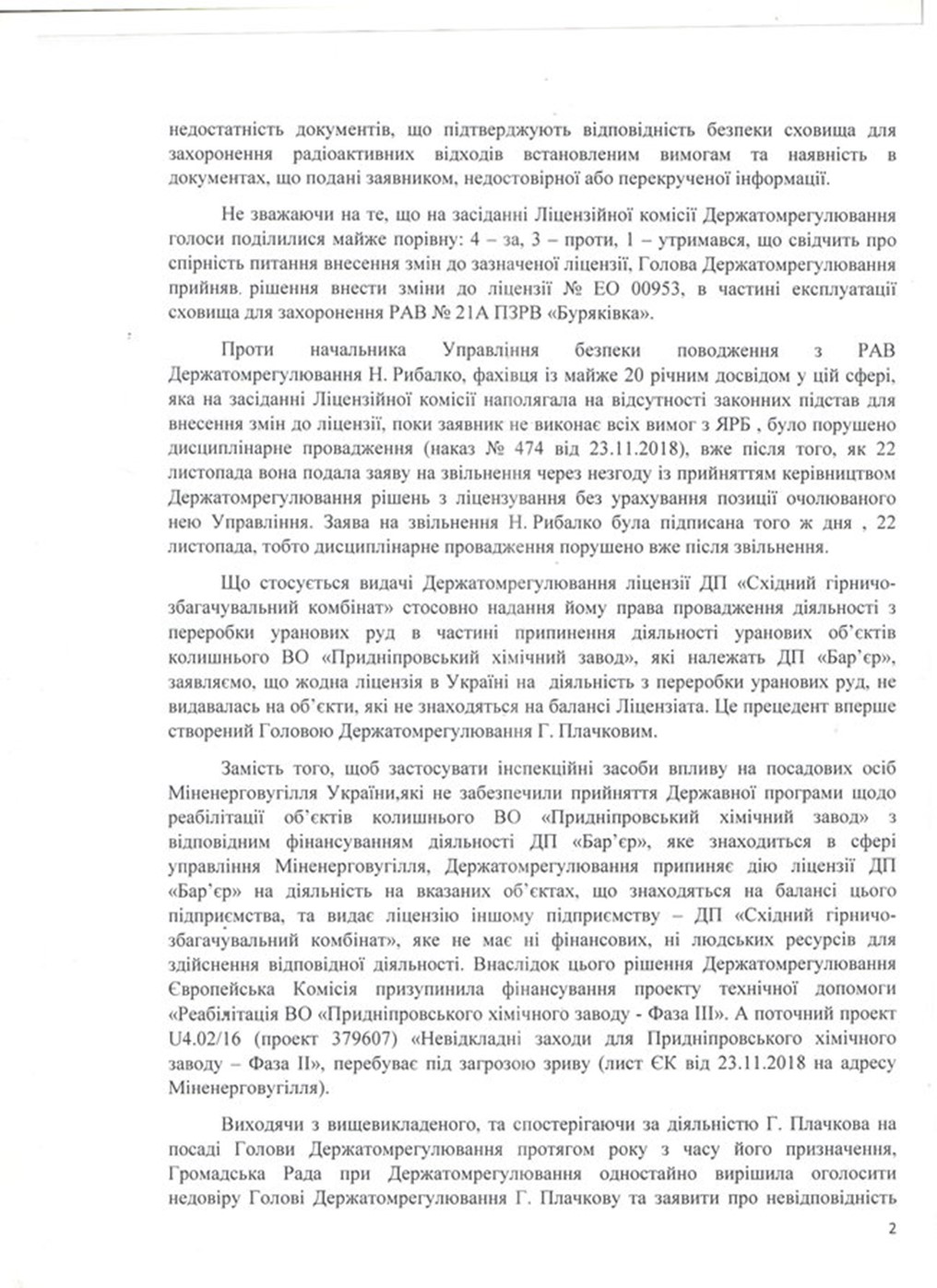 Все це викликало обурення професіоналів в галузі атомної енергетики і, як наслідок, Громадська рада при Державній інспекції ядерного регулювання України в 2019 році оголосила про недовіру голові відомства Григорію Плачкову.