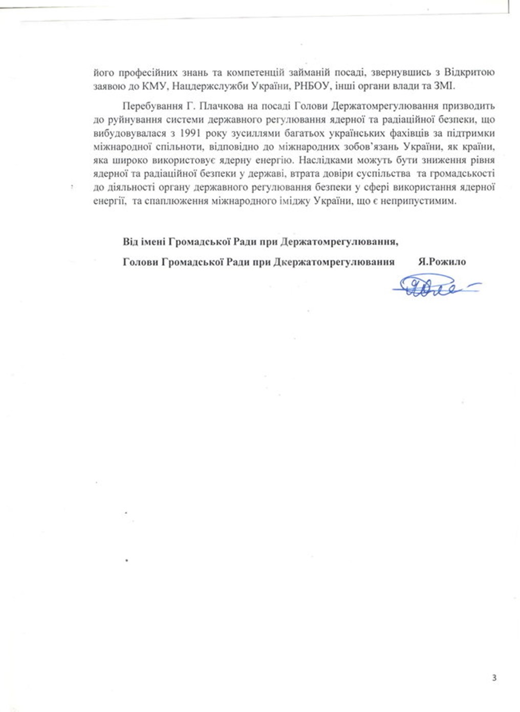 "Громадська рада при Держатомрегулюванні одноголосно вирішила оголосити про недовіру голові Держатомрегулювання Григорію Плачкову і заявила про його не компетентність", - сказано в заяві.