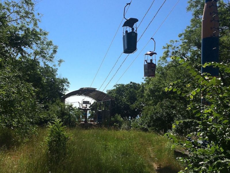 Канатная дорога над Тропой здороья. Издалека выглядит пугающе, но все веселятся в этих бочках. Может быть, у них это нервное.