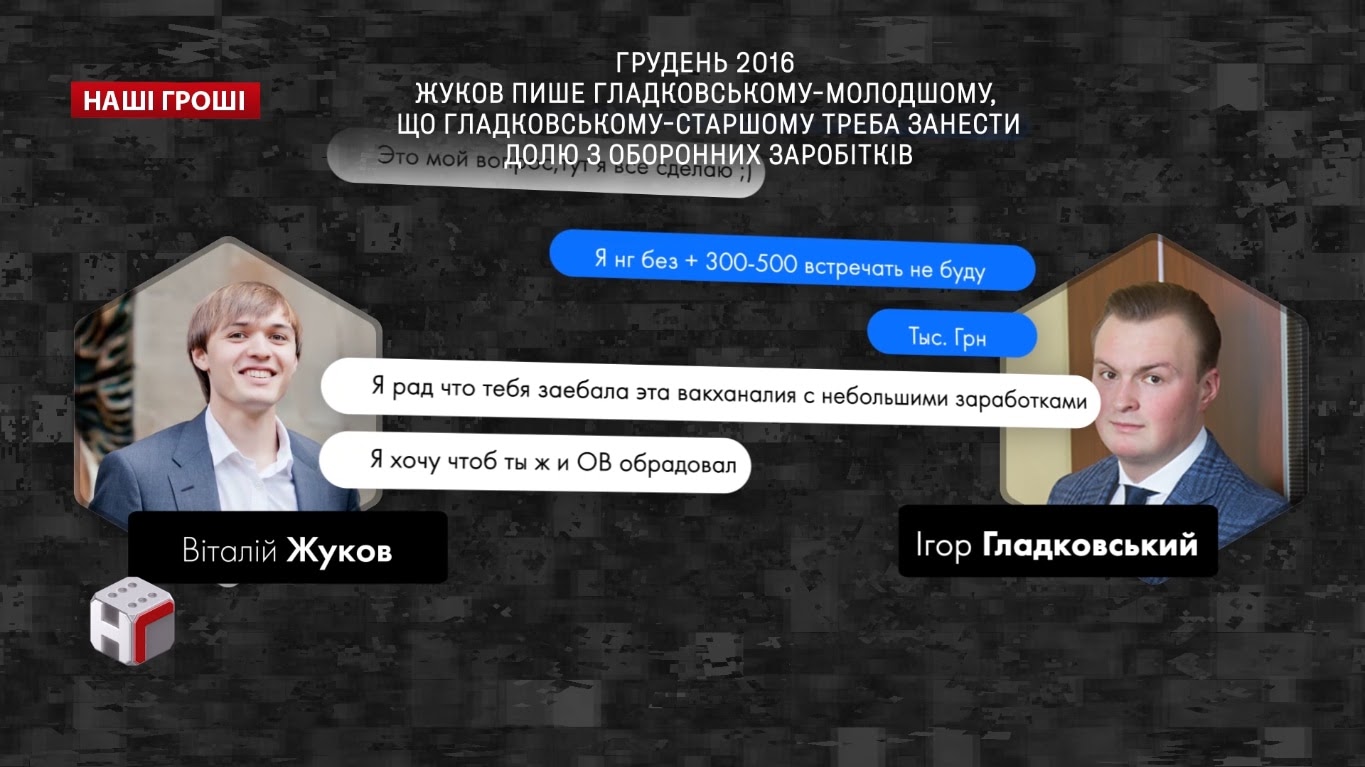 По данным следствия, Жуков заплатил Гладковскому-младшему 35 тыс долл. за влияние на должностное лицо УОП Павла Букина, чтобы возглавляемый им "Укрспецэкспорт" дал 7 млн грн финансовой помощи Житомирскому бронетанковому заводу, чтобы тот, в свою очередь, расплатился с "Оптимумспецдеталью", то есть, за запчасти.