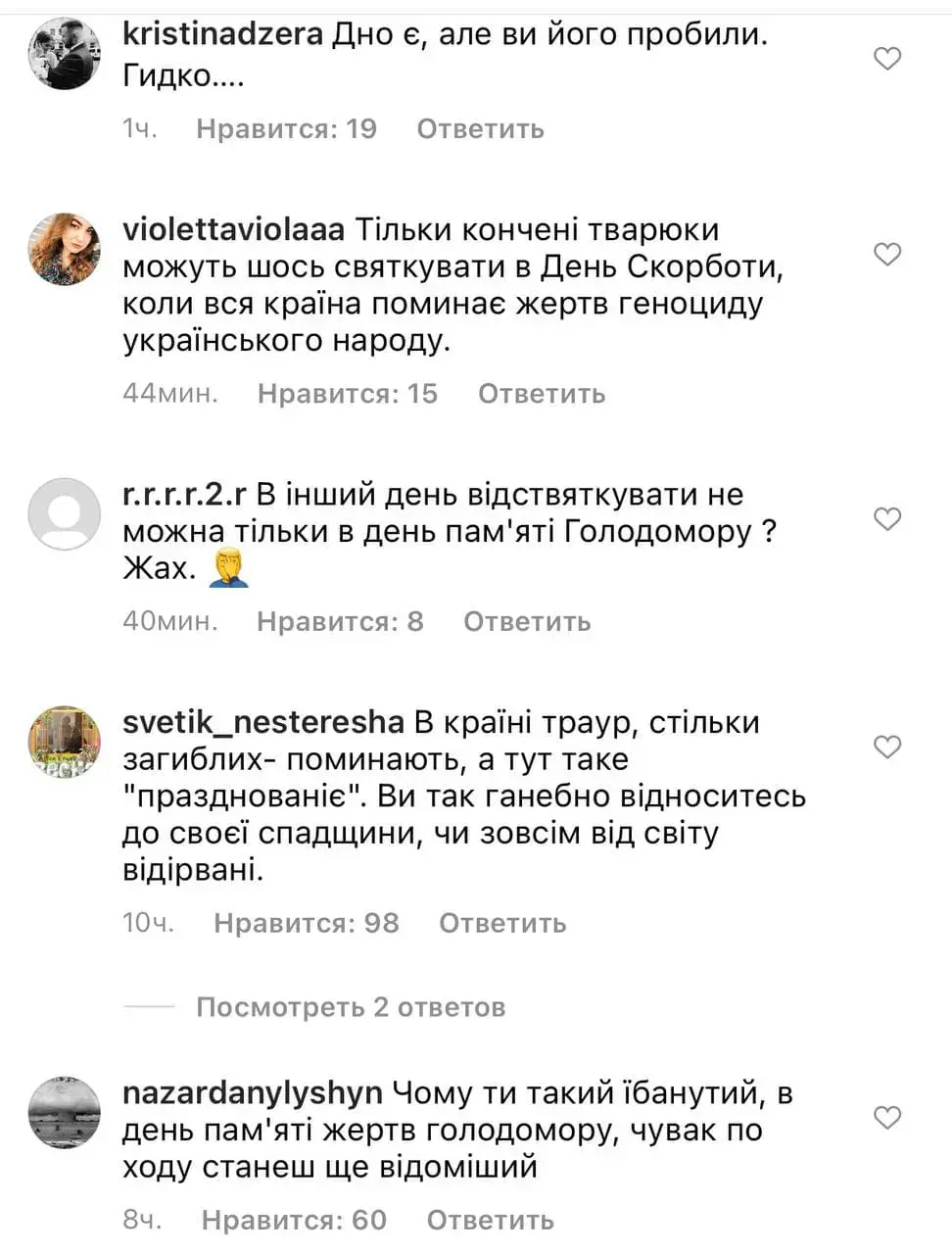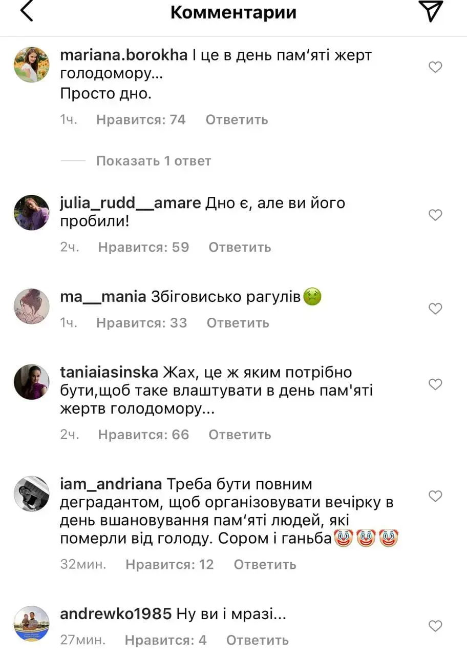 В комментариях пользователи социальной сети возмутились вечеринкой, которую устроили блогеры. Люди подчеркнули, что все происходило в День памяти жертв Голодомора и не стеснялись откровенных выражений для критики такого поведения.