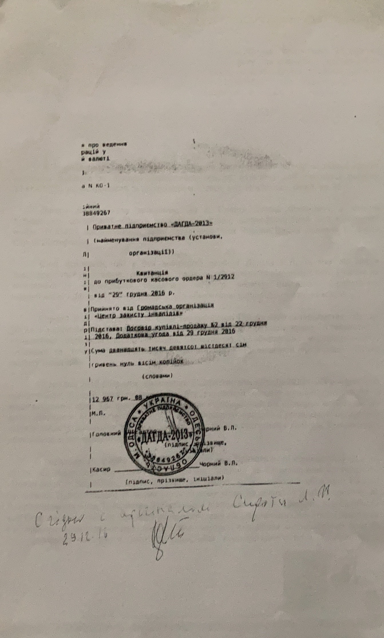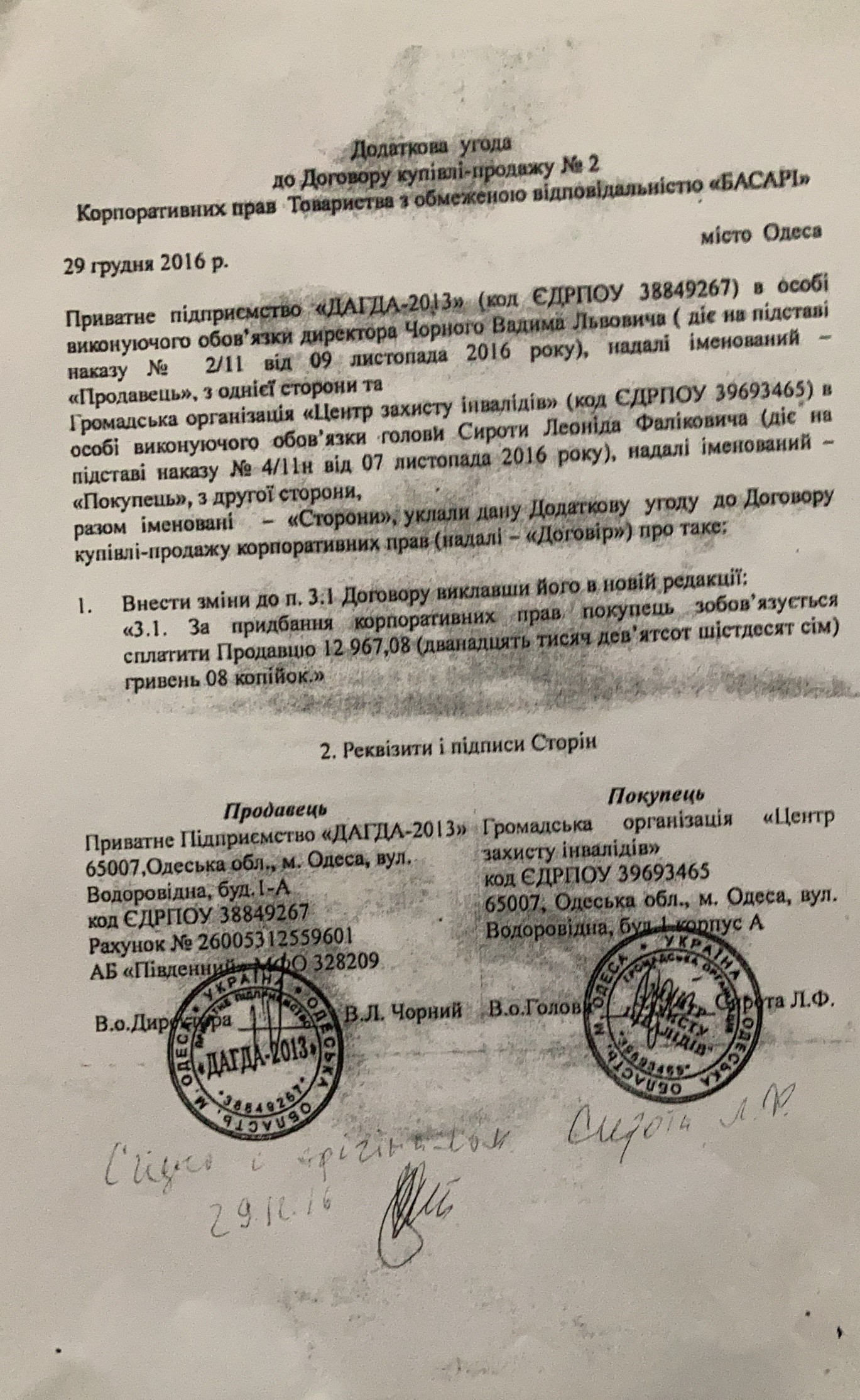 Согласно задуманному плану, через год, в 2016-м, юридические лица, также подконтрольные Вадиму Чёрному и его бизнес-партнёру, подписали договоры на покупку корпоративных прав с ОО «Центр защиты инвалидов» на общую сумму порядка 129 миллионов гривен. Данные договоры специально не были оплачены, а ОО стала номинальной управляющей компанией для всех остальных юридических лиц, на которые была оформлена недвижимость.
