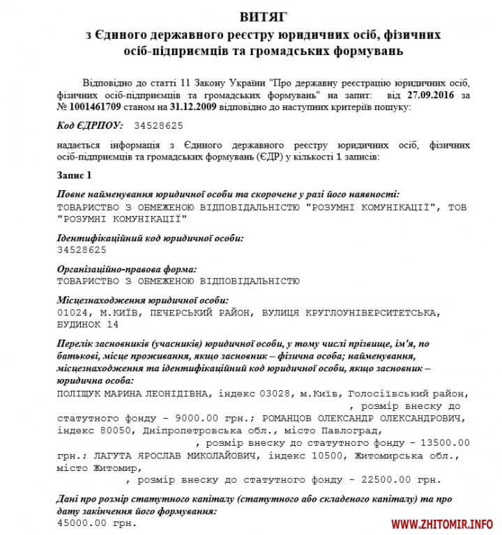 Сразу после досрочных выборов 2007 года (снова совпадение?) Лагута вновь меняет место работы, и с января 2008-го устраивается советником директора по развитию бизнеса в ООО «Умные коммуникации» (34528625). Через несколько месяцев Лагута выкупил долю в этой фирме и став её совладельцем. Фактически он владеет ей и сегодня, переписав на свою супругу Наталью Васильевну Лагуту (в девичестве Кожара). Причем, с этой перепиской возникла непонятная ситуация. Согласно декларациям Лагуты, он сделал это еще в 2014-м году, готовясь к госслужбе. Однако в сентябре 2016 года житомирские журналисты сделали официальную выписку из открытого реестра, в которой владельцем фирмы фигурировал Ярослав Лагута (см. документ). Получается, что, будучи большим чиновником, он нарушал украинские законы, да еще и подавал недостоверную декларацию?
