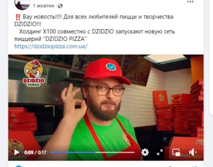 Ну а если личности «миллиардера» оказывается недостаточно, привлекаются известные люди со стороны. Например, 1 октября в сообществе Х100 в Фейсбук появилась новость о том, что компания открывает сеть заведений «DZIDZIO PIZZA». Лицом которой является известный украинский певец. Ну как тут не поверить в «серьезные намерения» инвесторов?