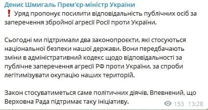 "Сегодня мы поддержали два законопроекта, которые касаются национальной безопасности нашего государства. Они предусматривают изменения в административный кодекс относительно ответственности за публичное отрицание агрессии РФ против Украины, попытки легитимизировать оккупацию наших территорий", - говорится в сообщении.