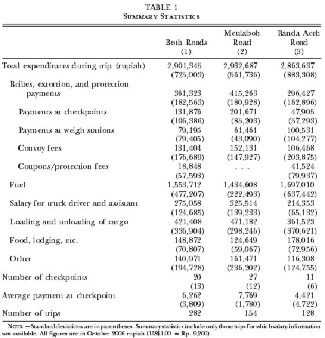 Экономисты Бенджамин Олкен и Патрик Баррон осуществили довольно интересный проєкт, изучая коррупцию в полевых условиях. Их ассистенты ездили по Индонезии, стране с довольно высоким показателем коррупции, сопровождая местных водителей грузовиков, перевозивших разные грузы из джунглей в порты, фабрики и т.д. Их часто останавливали на полицейских и армейских блокпостах, а также на станциях весового контроля.