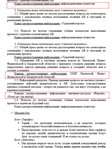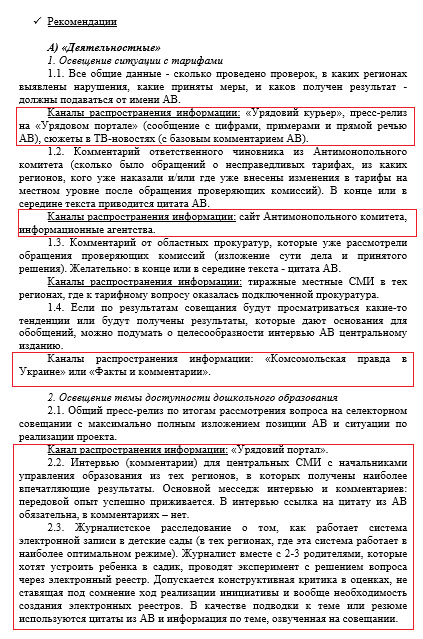 Ну і остання частина аналітичної записки – найбільш цікавою буде для видання "Телекритика", в ній "рекомендуються" канали розповсюдження інформації: окрім урядових видань та сайту Антимонопольного комітету в списку присутні "Комсомольська правда" та "Факти і Коментарі".