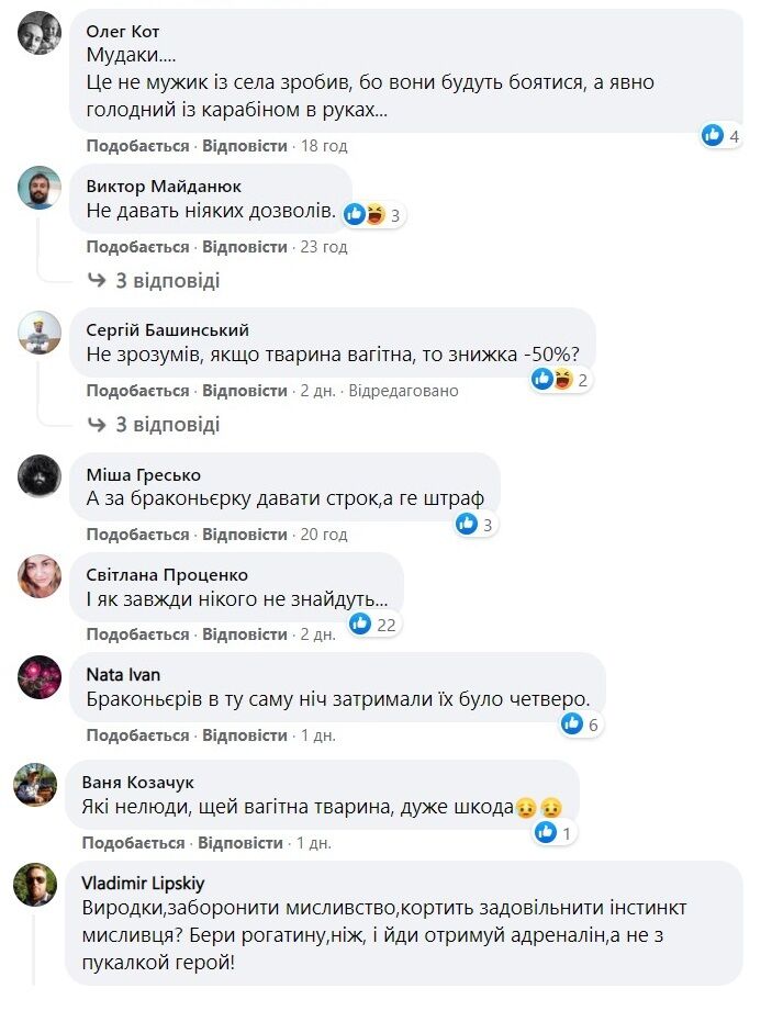 "Нет слов", "Какие изверги, еще и беременное животное, очень жаль", "Это не мужик из села сделал, потому что они будут бояться, а явно голодный с карабином в руках", "Не давать никаких разрешений", "И как всегда никого не найдут", "Ублюдки, запретить охоту!" – возмутились украинцы.