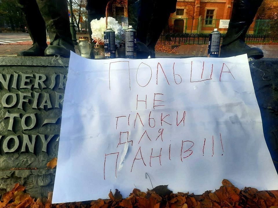 Вандалы оставили на месте преступления аэрозольные баллончики из-под краски и плакаты с провокационной надписью: «Польша не тильки для панива».