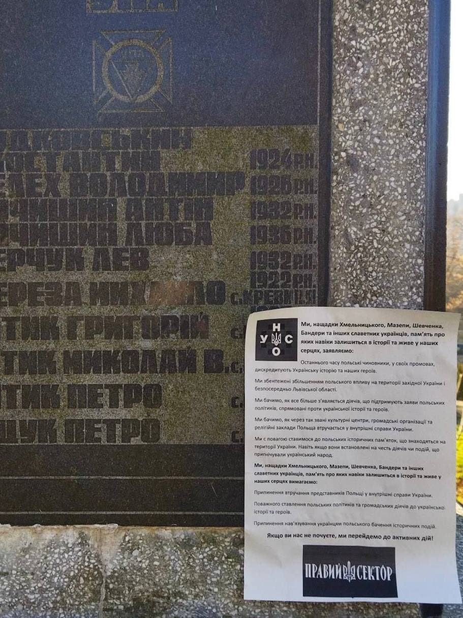 В частности, во Львове задержали активистов, пытавшихся нанести на мемориал захоронений польских воинов на Лычаковском кладбище листовки с требованиями к Польше.