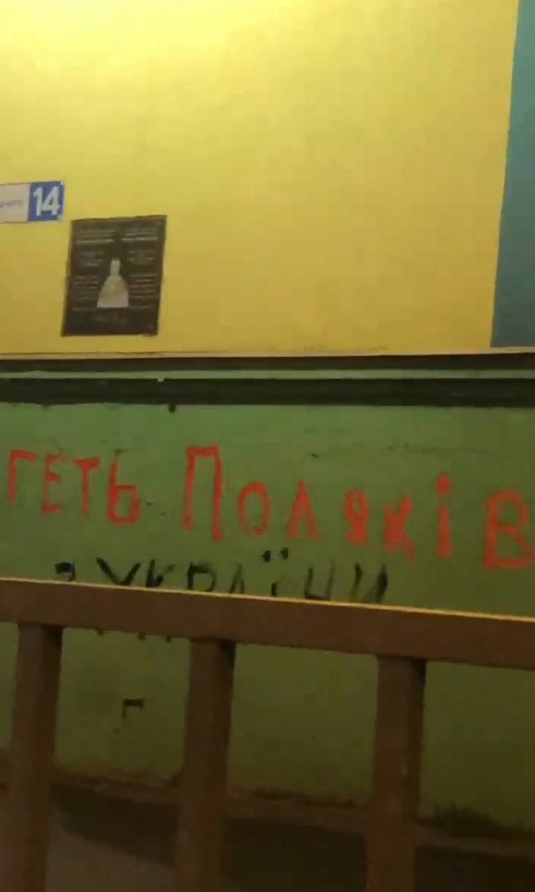 Правоохранители обнаружили на месте преступления надписи оскорбительного содержания в адрес поляков, но уже не в формате листовок, а просто написанные на стене дома лозунги: «Ляхи гореть в аду» и «Вон из Украины»