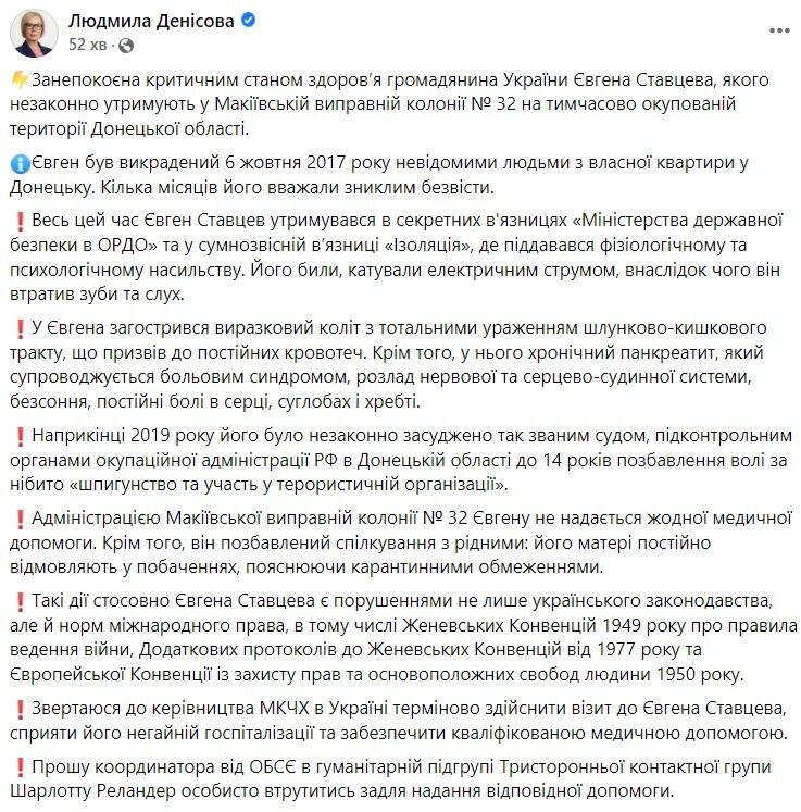 "Такие действия в отношении Евгения Ставцева являются нарушениями не только украинского законодательства, но и норм международного права, в том числе Женевских Конвенций 1949 года о правилах ведения войны, Дополнительных протоколов к Женевским Конвенциям от 1977 года и Европейской Конвенции по защите прав и основополагающих свобод человека 1950 года", – подчеркнула уполномоченная по правам человека.