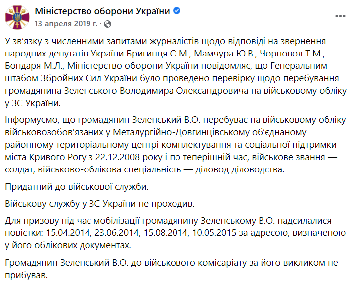 Ведомство опубликовало ответ и распространило его на всех своих площадках. Заявлялось, что Зеленский состоит на учете в своем родном Кривом Роге, к службе пригоден.
