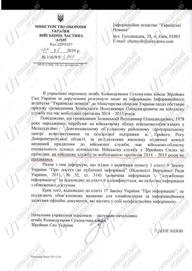 На запрос «Украинских новостей» ведомство летом 2019 года заявило, что Зеленский на военную службу в ходе мобилизации не призывался. На вопрос, приходили ли ему повестки, Минобороны отвечать не стало, сославшись на секретность этих данных.