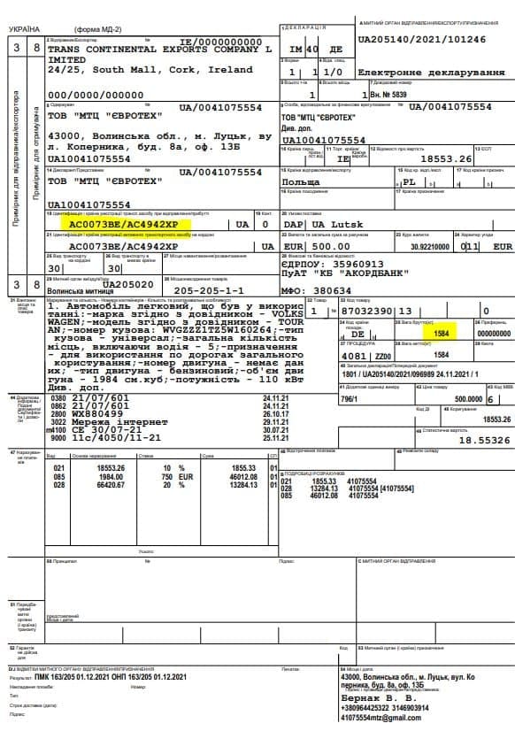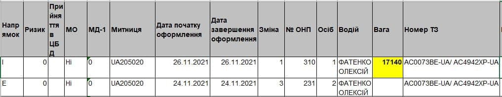 Вес каждой такой фуры превышал вес груза по декларации в несколько раз. Например, автомобиль AC0073BE-UA/ AC4942XP-UA, который проходит в материалах дела Львовского ДБР и который заехал на «Ягодын» 26 ноября.