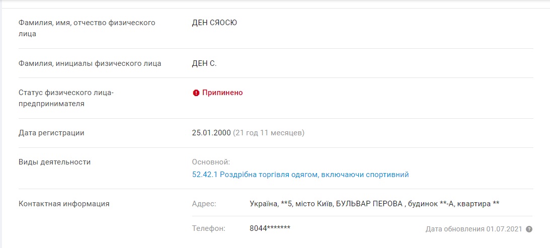 Судя по указанному виду деятельности – «Розничная торговля одеждой» и адресу – бульвар Перова, появился в нашей стране Ден Сяосю в качестве рядового китайского торговца с Троещинского рынка. Продержался он в качестве предпринимателя недолго – в январе 2001 года регистрация была аннулирована. Кстати, почему-то был аннулирован и его Индивидуальный налоговый номер: