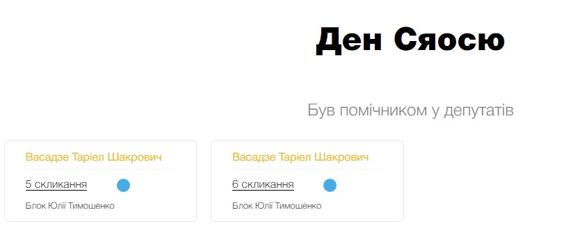На некоторое время следы Дена Сяосю теряются. Но в 2006 он возникает в совершенно неожиданной ипостаси, как для бывшего торговца с Троещинского рынка. Упоминание о Дене Сяосю удается найти на сайте «Посипаки», который ведет учет помощников народных депутатов Украины. В пятом созыве (2006-2007 годы) Ден Сяосю значится в качестве помощника у нардепа от блока Юлии Тимошенко Тариэла Васадзе, в шестом (2007-2012) – у него же: