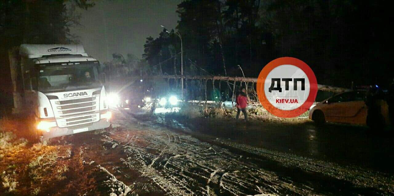 На повороте на Вышгород возле контрольного пункта полиции произошло двойное ДТП. Одно дерево упало на легковушку, а другое – на грузовик.