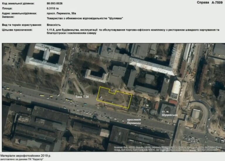 О том, что участок площадью 0,31 гектара (кадастровый номер 8000000000:88:093:0026) находится на территории сквера «Слава танкистам» вблизи станции метро «Шулявская», даже не стоит упоминать – кого этим сейчас удивишь? Также, как и то, что рядом с участком находится Архитектурно-строительная библиотека имени Заболотного, которой грозит выселение.