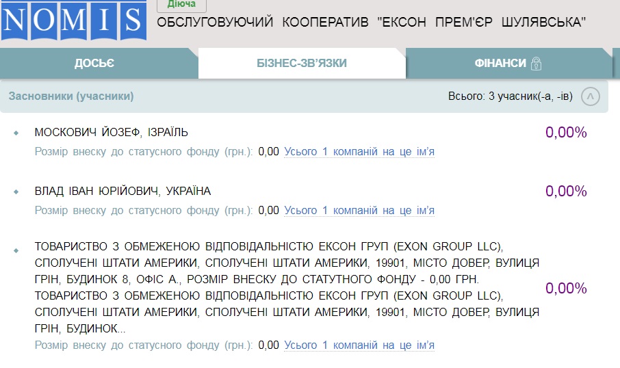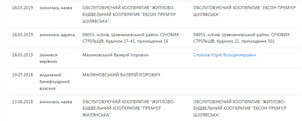 Видимо с «Жилянской» что-то не пошло, потому что уже в 2018-м компанию переименовывают в Обслуживающий кооператив ЖСК «Эксон Премьер Шулявская», а место киевлянина Валерия Малиновского в составе учредителей компании занимает фирма ЕХОN GRОUР LLС, зарегистрированная в американском штате Делавер.