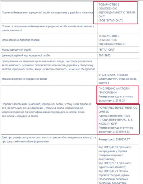 Співзасновниками фірми "Вітал-Ойл" є той самий Анатолій Писаренко та офшорна компанія POWERFILD INVESTMENT CO LIMITED, зареєстрована на Кіпрі. В одному з інтерв’ю Писаренко хвалився, що одним з бізнесів є видача у лізінг літаків. Співзвучна компанія Powerfield Investment Co. Limited, однак прописана у США, володіє одним з літаків української авіакомпанії Хорс.