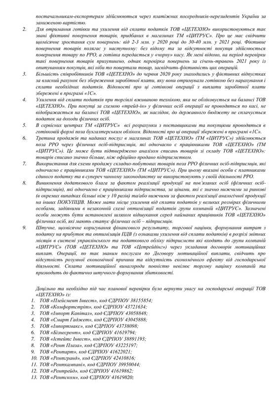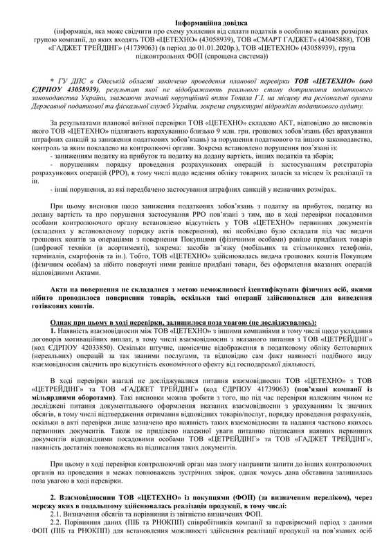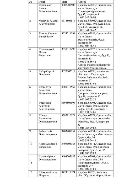 Справка настолько полная и красивая, что зачитаться можно. Фактически можно распечатывать и идти в суд за ордерами на обыски и выемки. Отдельным списком я получил список всех фиктивных ФОПов, которые предположительно использует «Цитрус» в своей работе.