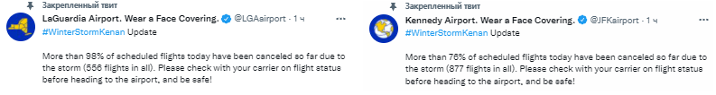 Аэропорт имени Джона Кеннеди сообщил в Twitter об отмене 877 авиарейсов (это 76% от общего числа запланированных полетов). Также почти полностью прекратил свою работу аэропорт Ла-Гуардиа, там отменили 556 рейсов (98% от своего воздушного трафика).