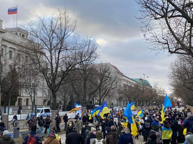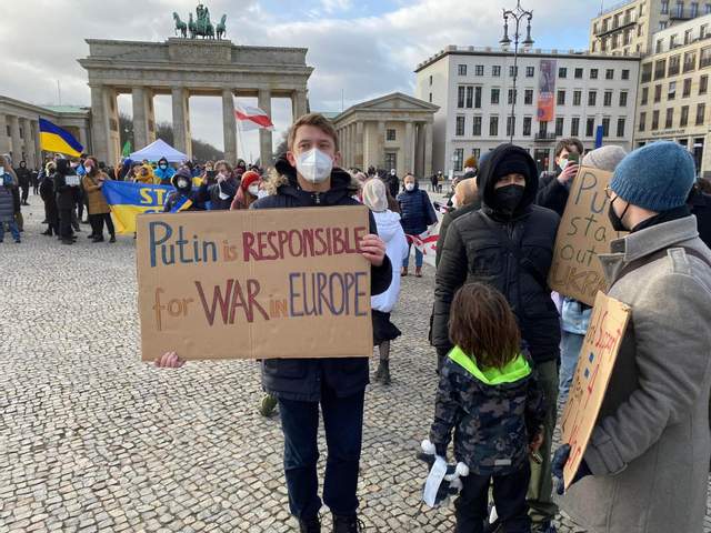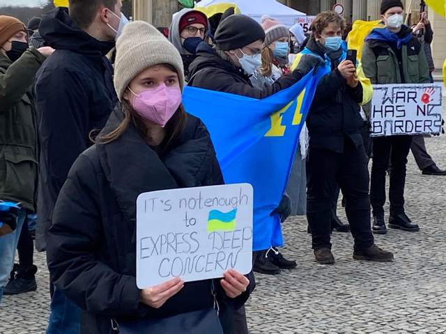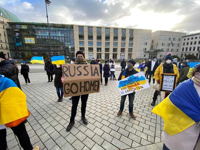 Участники считают, что официальный Берлин может использовать свое влияние на Москву, чтобы остановить агрессию против Украины. Десятки людей пришли с сине-желтыми флагами и флагами крымскотатарского народа. Они держали в руках плакаты, на которых было написано: "Путин – ответственный за войну в Европе", "Беспокойства – недостаточно", "Россия, иди домой".