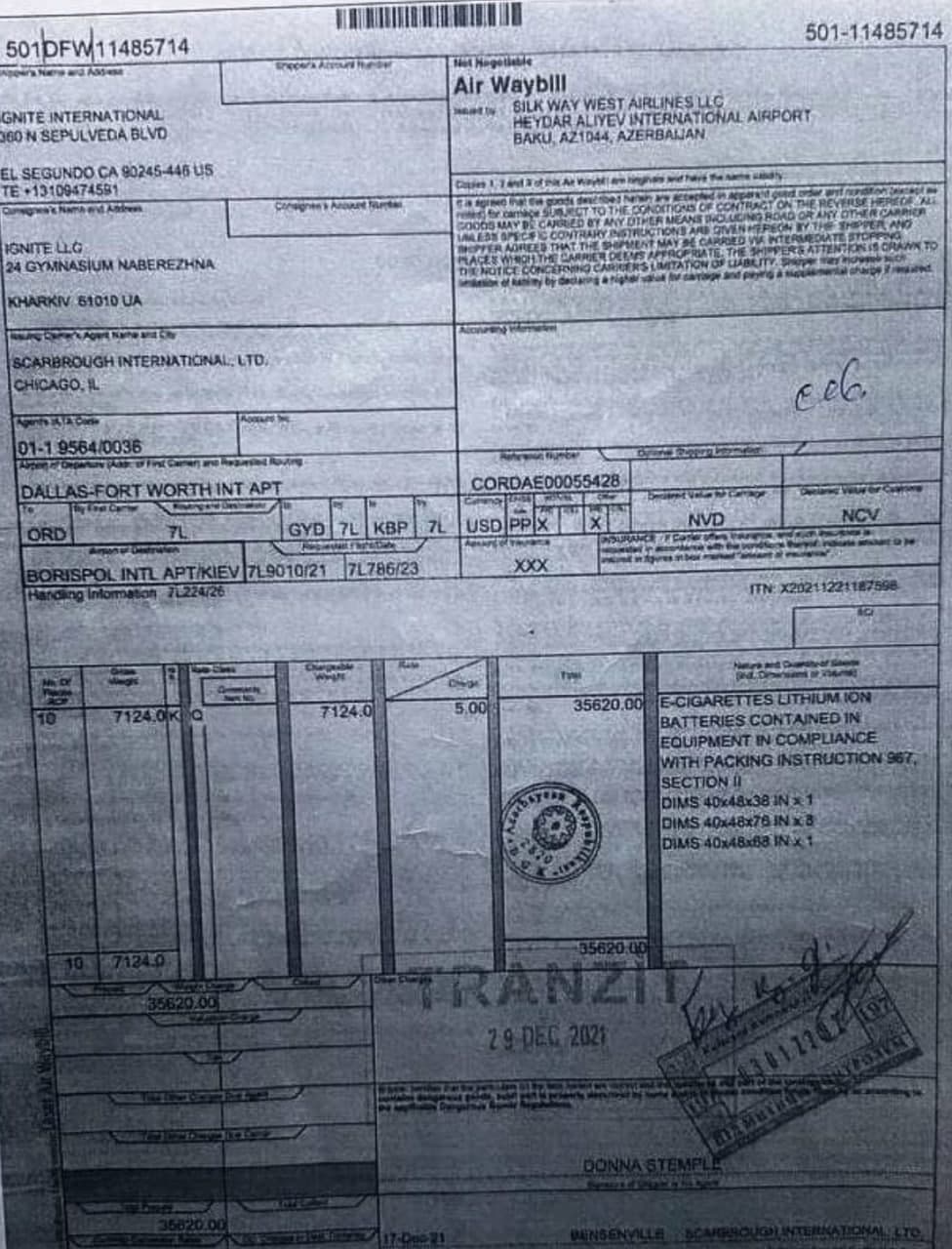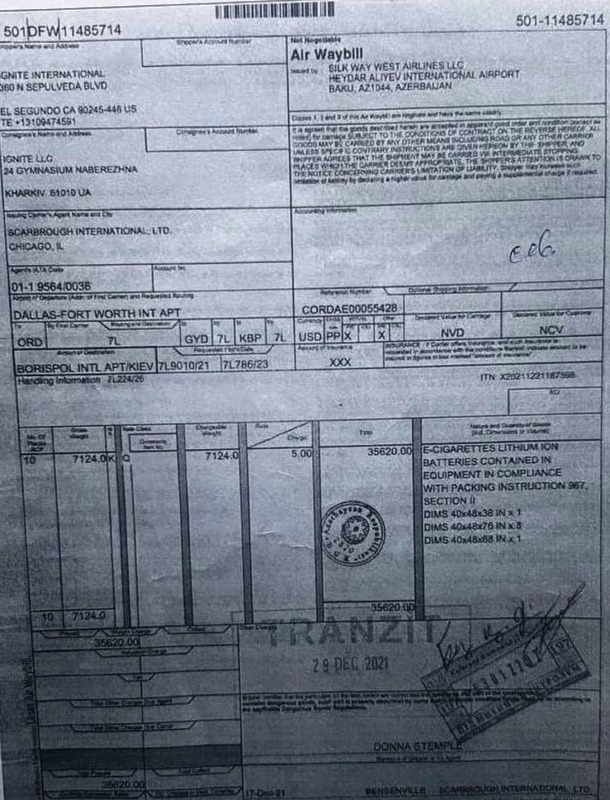 27 января, в «Борисполь», прилетела партия электронных сигарет без акцизных марок, весом 7124 кг. Авианакладная №501-11485714.