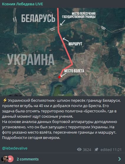 Тем временем белорусская журналистка Ксения Лебедева опубликовала схему маршрута украинского беспилотника, который якобы был сбит над территорией Беларуси.