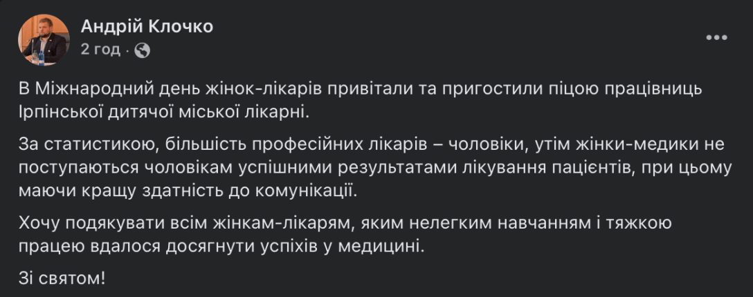 Народний депутат із фракції "Слуга народу" Андрій Клочко, який фігурує у провадженні про незаконне збагачення, привітав медичних робітниць дитячої лікарні в Ірпені Київської області з Міжнародним днем жінки-лікаря.