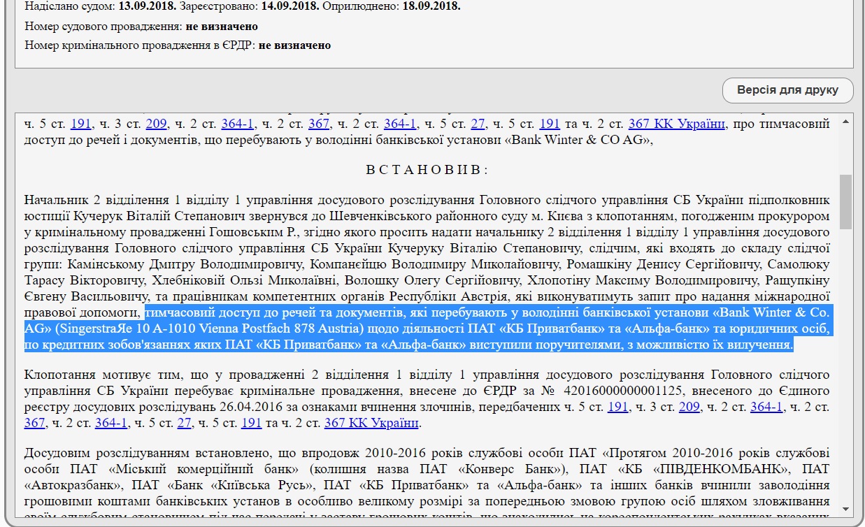Имеется в активе банка и другое уголовное дело - № 42016000000001125. Здесь уже речь идет о международной схеме: украинские банки, в том числе Альфа Банк Украина, размещали свои средства на счета в иностранном банке. Последний под залог этих средств выдавал кредит для компании, так или иначе связанной с украинским банком. Когда же компания-заемщик не возвращала иностранному банку кредит, он списывал с корсчета украинского банка заставленные средства.