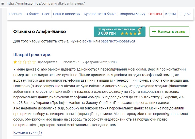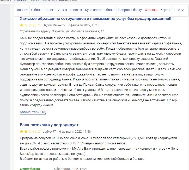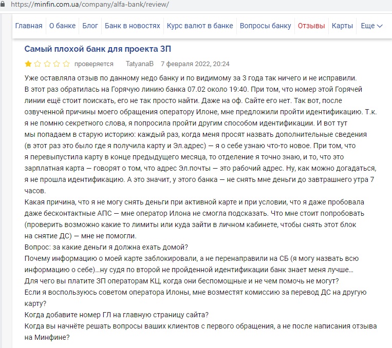 «Шахраї і рекетири», «Самый плохой банк для проекта ЗП», «Никогда не было и вот опять)», «Хамское обращение сотрудников и навязывание услуг без предупреждения!!!», «Банк потихоньку деградирует», «отвратительное качество услуг»… Это – отзывы подряд, не выборочно. Можете сами удостоверится. И они тоже идут явно в разрез с тем, что можно прочитать на официальном сайте Альфа Банк Украина.