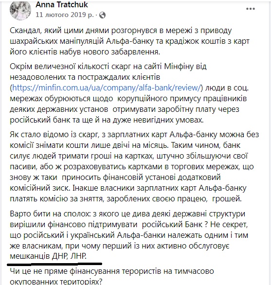 Есть у Альфа Банк Украина и след, связывающий его с террористами народных джамахерий «ДНР» и «ЛНР». Вот что писала еще в 2019 году пользовательница Фейсбук Anna Tratchuk: «Стоит бить тревогу: с какой стати некоторые государственные структуры решили финансово поддерживать российский Банк? Не секрет, что российский и украинский Альфа-банки принадлежат одним и тем же владельцам, причем первый из них активно обслуживает жителей «ДНР», «ЛНР». Не прямое ли это финансирование террористов на временно оккупированных территориях?»