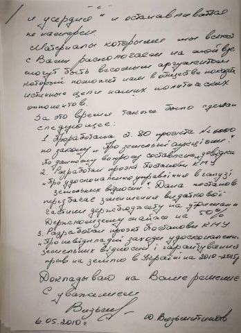 Также наша редакция располагает заявлением-доносом на Юлию Тимошенко, написанным и подписанным Юрием Вязьмитиновым на имя тогдашнего премьер министра Николая Яновича Азарова. Беглое прочтение этих документов показывает, насколько далеко Юрий Вязьмитинов может зайти при желании выслужиться перед вышестоящим начальством, показать свою преданность и выполнять любые хотелки.