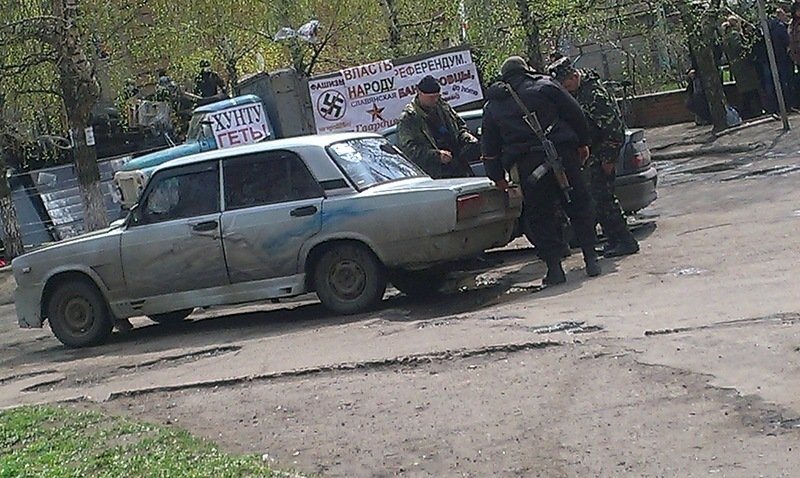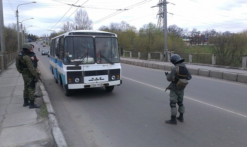 Славянск не контролируется украинскими властями. Город полностью находится во власти захвативших его группировок сепаратистов, и представляет собой эдакое Гуляйполе, со всех сторон обнесенное баррикадами из покрышек. Баррикады устроены на въездах в город в несколько рядов. На них стоят уже привычные всем молодые ребята в масках и касках – кто с автоматом, кто с палкой. На некоторых стражниках надеты светоотражающие жилеты сотрудников ГАИ. Они с видимым удовольствием останавливают машины, просят открыть багажник, проводят осмотр. Власть до небес превозносит чувство собственной важности обычного пэтэушника, который еще вчера стыдливо платил 20 гривен за зачет.