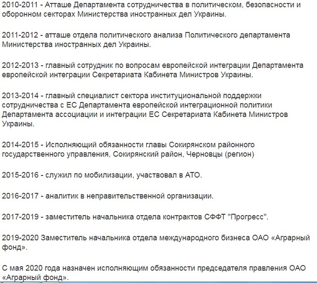 Впрочем, давайте вернемся в «Аграрный фонд». Знакомьтесь – Богдан Николаевич Банчук, назначенный в мае 2020 года руководителем Фонда. Возраст – 35 лет, на момент назначения – 33 года. В 2010 году окончил Киевский национальный университет имени Тараса Шевченко, международный юрист, переводчик по французскому языку. Вот выдержка из его биографии: