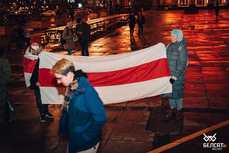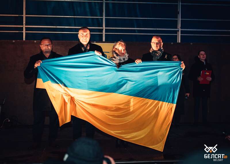 Акция солидарности с Украиной состоялась вечером в центре Варшавы – перед Дворцом культуры и науки. Участники акции держали государственные флаги Украины и Польши, национальные бело-красно-белые флаги Беларуси.