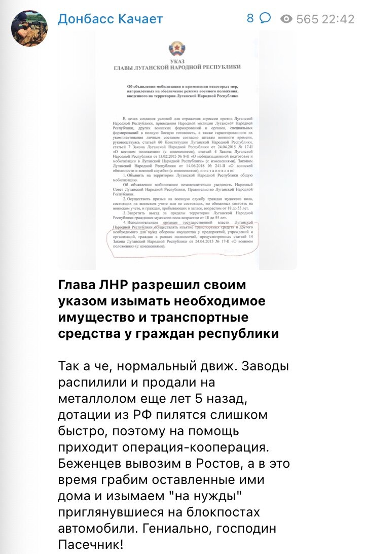 "Так а че, нормальный движ. Заводы распилили и продали на металлолом еще лет 5 назад, дотации из РФ пилятся слишком быстро, поэтому на помощь приходит операция-кооперация. Беженцев вывозим в Ростов, а в это время грабим оставленные ими дома и изымаем "на нужды" приглянувшиеся на блокпостах автомобили. Гениально, господин Пасечник!", - написал "Таксист".