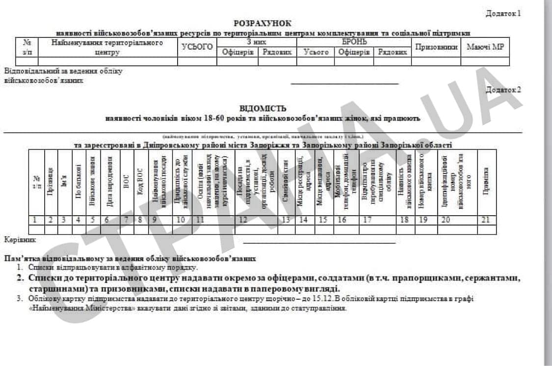 В письме от Запорожского военкомата говорится, что в случае неподачи или затягивания сроков подачи руководителей привлекут к ответственности согласно действующему законодательству.