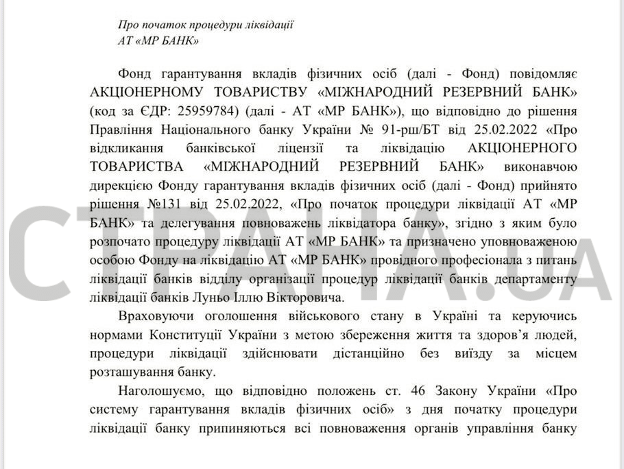 Ликвидация значит, что вклады в Международном резервном банке/Сбербанке выплатит Фонд гарантирования вкладов физлиц Украины (депозиты, средства на карточных и текущих счетах). А сам банк будет ликвидирован, закрыт.