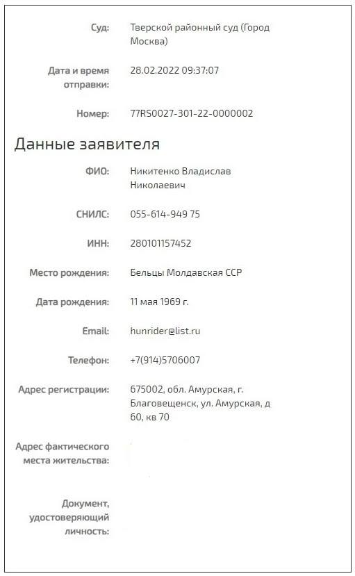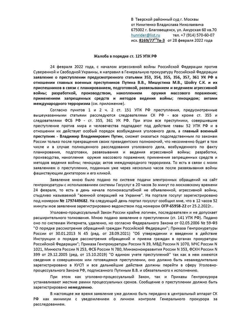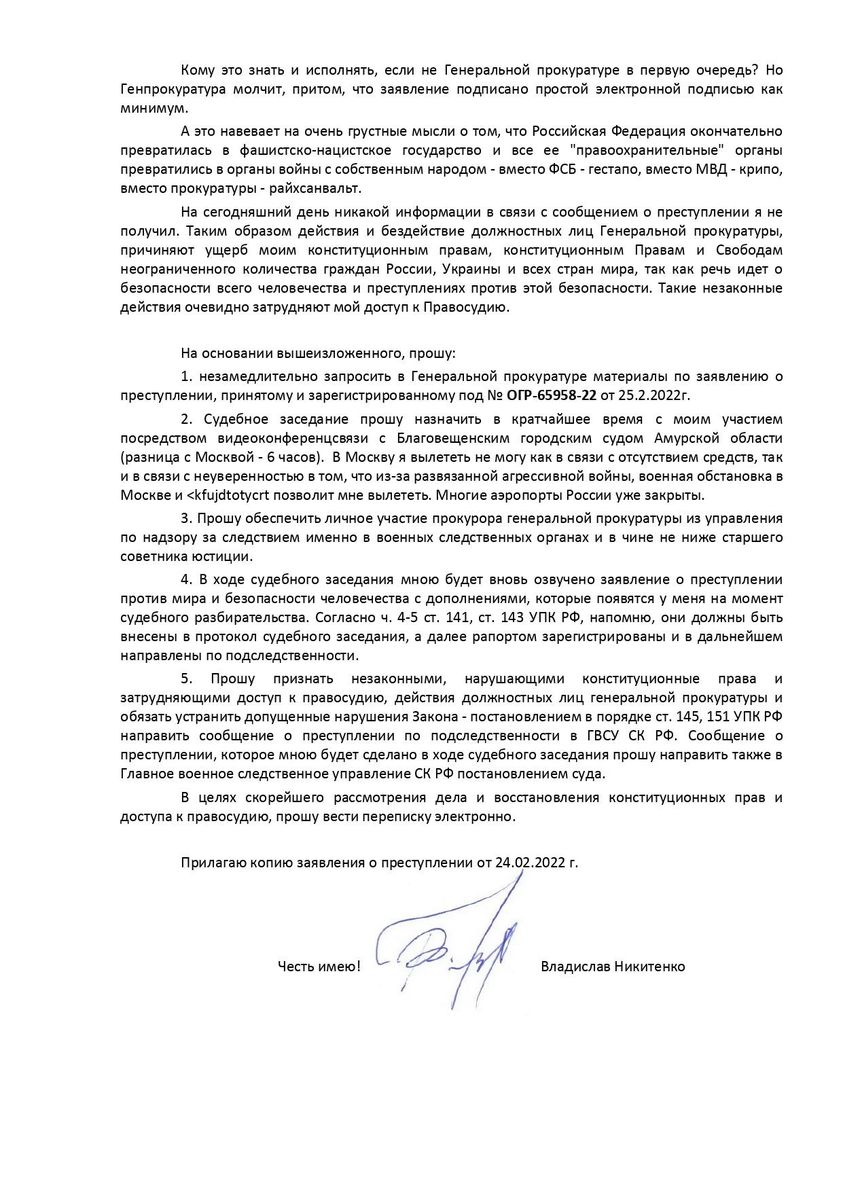 Я прошу вас иметь в виду и уведомить международные субъекты права о том, что такой опыт я пытаюсь сделать и внутри нацистского государства. Если суды не станут рассматривать жалобы, я хотел бы чтобы Вы, помогли мне в дальнейшем признать судебное сообщество, МВД, СКР, росгвардию и т.д. и т.п. преступными организациями. Все мои контакты находятся в файле о приеме заявления судом. Я непременно желаю быть свидетелем обвинения в уголовном процессе над Путлером. Вашу бывшую коллегу — наташку «няш-Мяш» поклонскую я называл самой высокооплачиваемой политической и юридической проституткой мира, она на меня обижалась, но даже под надзором лично Чайки и Бастрыкина уголовное дело на меня не завели» — сообщил российский правозащитник Владислав Никитенко.