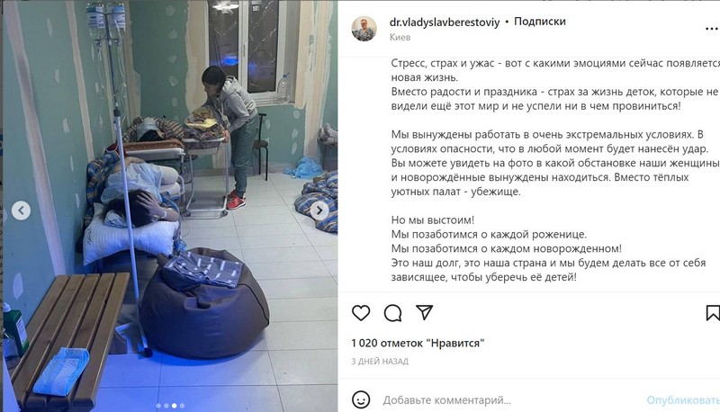 «Стресс, страх и ужас — вот с такими эмоциями сейчас появляется новая жизнь. Вместо радости и праздника — страх за жизнь деток, которые не видели еще этот мир и не успели ни в чем провиниться! — написал в Instargam акушер-гинеколог Киевского роддома№ 5 Владислав Берестовой. — Мы вынуждены работать в очень экстремальных условиях. В условиях опасности, что в любой момент будет нанесён удар. Вы можете увидеть на фото в какой обстановке наши женщины и новорождённые вынуждены находиться. Вместо тёплых уютных палат — убежище. Но мы выстоим!»