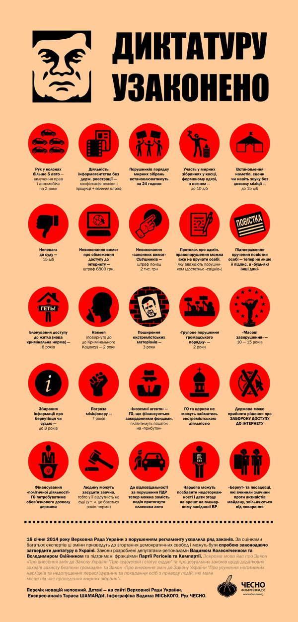 - Пакет законов, принятых 16 января 2014 года. Они ограничили свободу граждан, а правоохранительным органам предоставляли свободу действий в наказании участников акций протеста. Пятым в колоне не становись, и прочее.