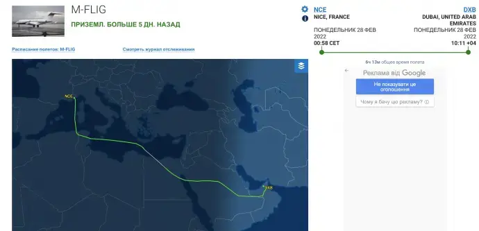28 февраля из Ниццы в Дубай прилетел самолет Bombardier Global 5000, которым, по данным источников УП, пользуются братья Ротенберги.