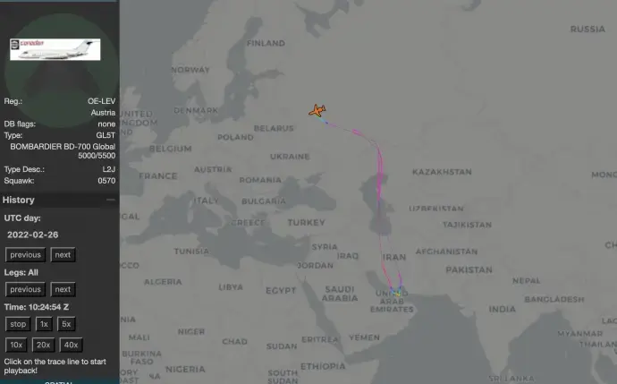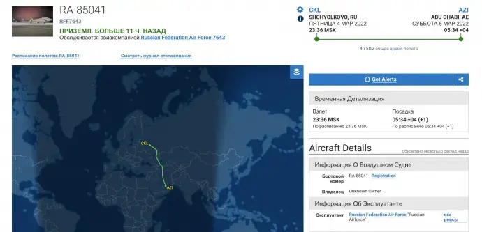 24 февраля в Дубай прилетел борт Bombardier Global 7500 Сергея Чемезова. Самолет вылетел из Москвы, сделал стыковку в Тель-Авиве и направился в Эмираты. Вернулся в Москву самолет только 3 марта.