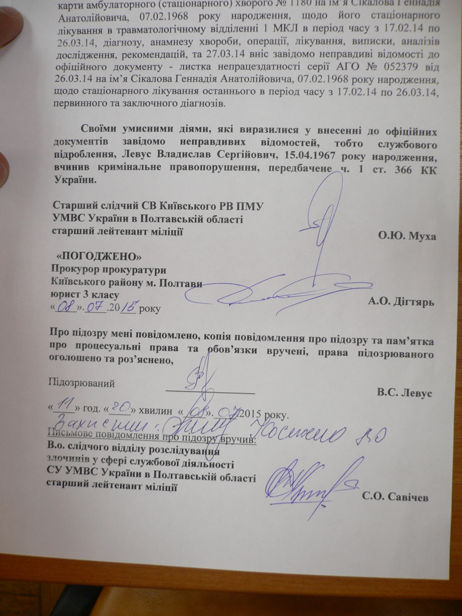 Як сказано в підозрі, що Левус В.С., працювавши на посаді головного лікаря першої міської клінічної лікарні м. Полтави (надалі 1МКЛ - ОБ), заніс завідомо неправдиві дані в історію хвороби громадянина Сікалова Г.А. стосовно зробленої йому операції на лівому плечі.