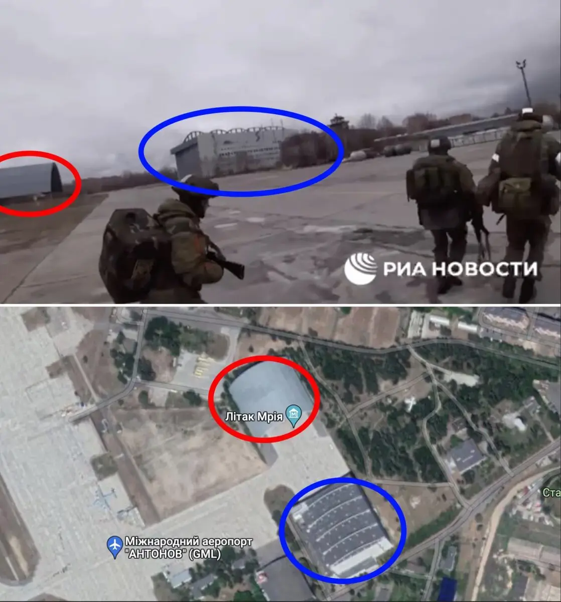 Видео опубликованное пропагандистами позволяет с легкостью сделать привязку к местности и с уверенностью утверждать, что это аэропорт Гостомеля.